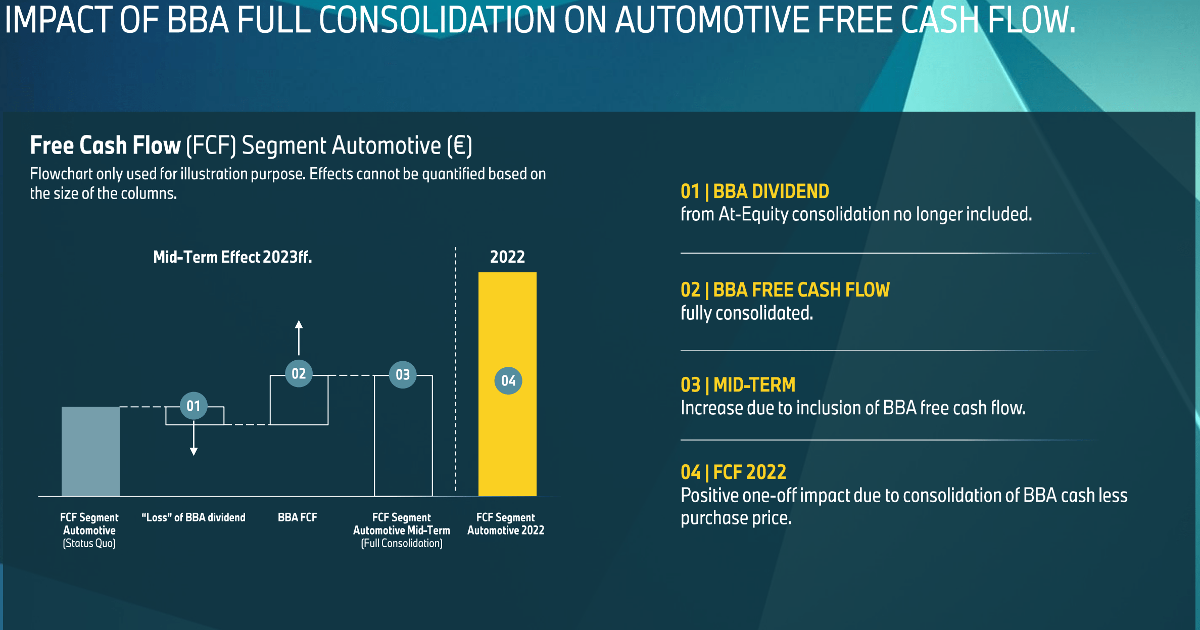 Now, in 2022 we will see a big spike in free cash flow due to the fact that BMW recently increased its stake in its BBA Chinese joint venture from 50% to 75%. As shown from the slide below, the net amount from consolidation of BBA’s liquid funds amounted to €5 billion and will increase the 2022 free cash flow. Investors should know this will be a one-time event with an impact on 2022 results, but, more than a big spike in numbers, it will be important to assess the benefit of this operation which aims at strengthening BMW’s position in China.