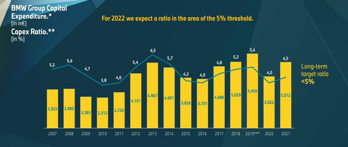 If we look at BMW’s last ten years we see that the company increased its delivered cars from 1,845,186 in 2012 to 2,521,514 in 2021. This went along with a clear increase in its top line at a CAGR of 3.66%, which brought total revenues up from €76.85 billion in 2012 to €111.24 billion in 2021. However, gross profit margins declined a bit as they were 20.2% back in 2012 and last year they came in at 19.8%. Since 2021 was a great year for automakers, it is important to know that in 2019 BMW saw its gross profit margin at 17.3%, which shows a downward trend. However, BMW has been good at managing costs and we see that while its capex/revenue ratio has come down from 5.4% in 2012 to 4.5% in 2021. This is particularly important as BMW, like many other automakers, is facing huge costs to implement the EV turnaround of the industry. As we see from the graph below, even though BMW is undertaking a massive turnaround in technology, its capex ratio is always withing the range between 4 and 5% which shows that the company has its costs under control