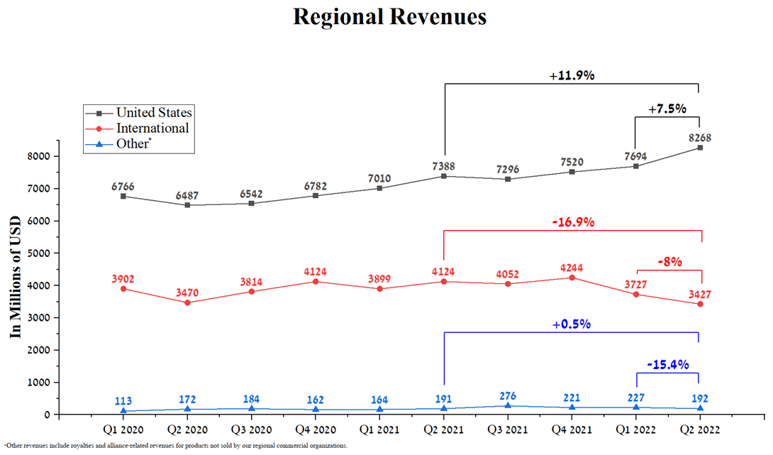 The reasons for the slight increase in Bristol-Myers Squibb’s revenue are the diverging dynamics of drug sales in the US and abroad, and the start of sales of Revlimid and Abraxane generics, which brought billions of dollars to the company before losing their exclusivity. In the US, BMY’s revenue was $8,268 million in the second quarter of 2022, up 11.9% year-over-year on strong demand for Eliquis and Opdivo. While international revenue was $3,427 million in Q2 2022, down 8% QoQ mainly due to lower demand for branded Revlimid and a significant depreciation of the euro and pound against the US dollar. In my estimation, currency risks will continue to negatively affect Bristol-Myers Squibb’s revenue growth until the military conflict between Ukraine and Russia ends and the energy crisis in Europe is resolved.