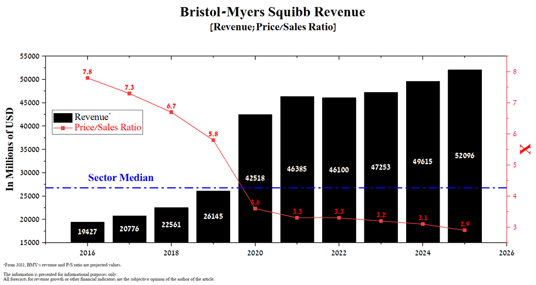 Bristol-Myers Squibb’s revenue came in at $11,887 million in Q2 2022, up 1.6% year-over-year. At the same time, the company’s P/S ratio is 3.28x at the end of June 2022, which is significantly lower than the average for the healthcare sector, thus indicating that BMY is undervalued by Wall Street.