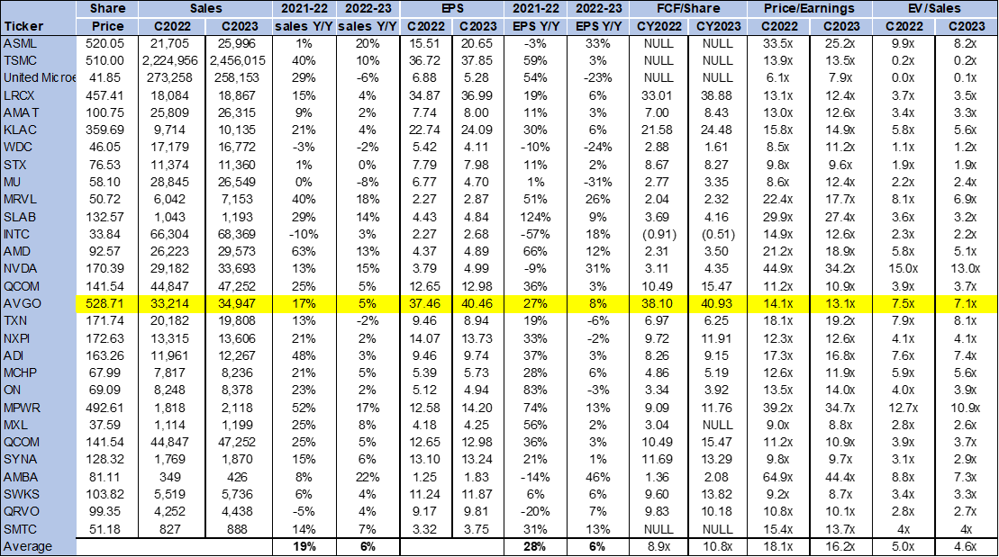 AVGO is trading at around $529. The stock is relatively cheap compared to the peer group. On a P/E basis, AVGO is trading at about 13.1x C2023 EPS of $40.46 compared to the group average of 16.2x. However, on an EV/Sales basis, the stock is more expensive than the peer group. The stock is trading at 7.1x C2023 on an EV/Sales basis compared to an average of 4.6x. The following chart illustrates the semiconductor peer group valuation.