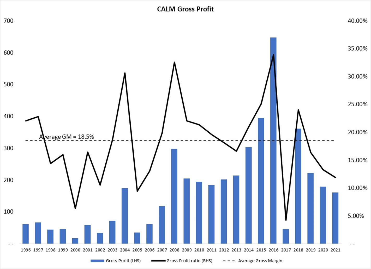 Figure 5 – CALM Gross Profits and Margins (roic.ai, macrotipstrading)