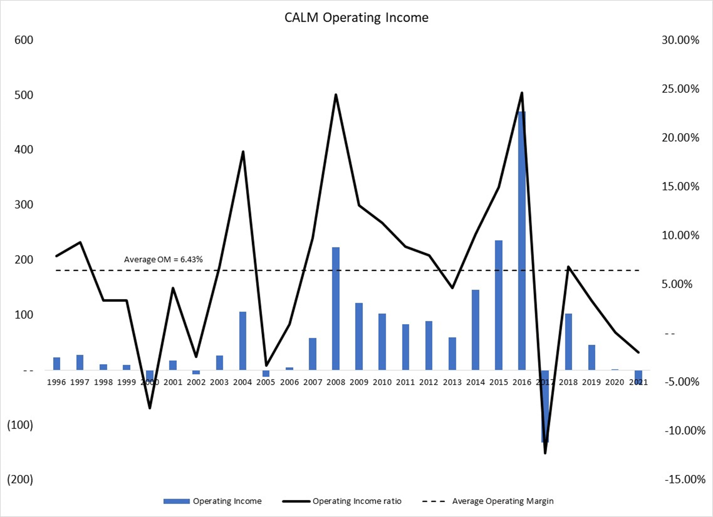 With the understanding that gross profit is highly volatile, another key metric to analyze is operating income, i.e. whether CALM stays profitable despite volatile gross profits. CALM’s average operating margin is a respectable 6.4%, although as can be seen in Figure 7, this series is highly skewed by the HPAI impacts.