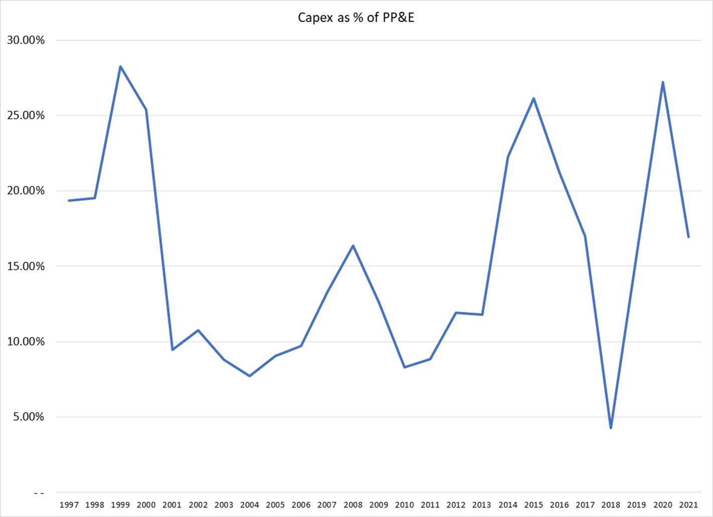 Figure 10 – CALM capex as % of PP&E (roic.ai, macrotipstrading)
