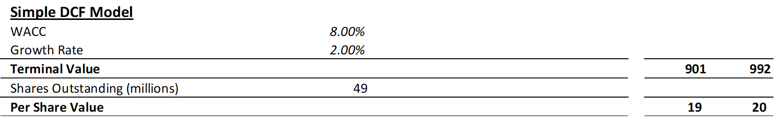 As the company has no long-term debt, its weighted average cost of capital is its equity cost of capital. Since CALM has been operating for over 60 years with no debt and stable businesses, I estimate its cost of equity to be 8%. Applying a 2% growth rate to be consistent with normal GDP growth, I arrive at a normalized per-share value of $19 to 20. A 1% change in the terminal growth rate or equity cost of capital adds $3 in value, all else being equal.
