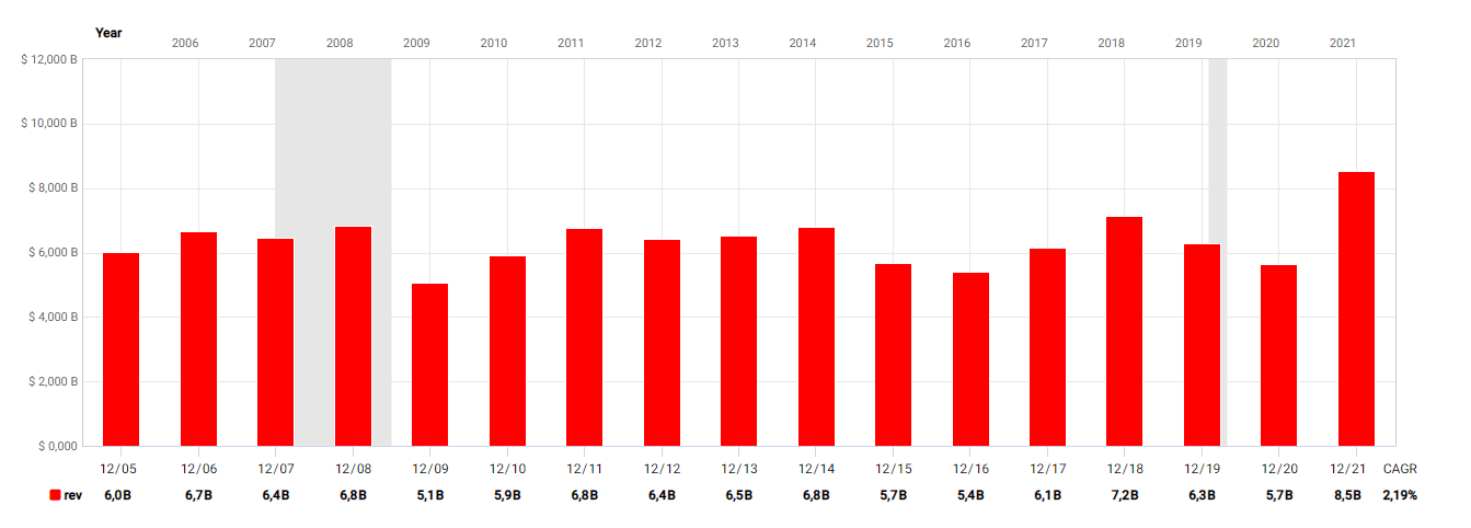 If you look at the company’s revenue trend, you will see that revenue has been essentially stagnant from 2005 until 2020, always averaging around $6 billion per year.
