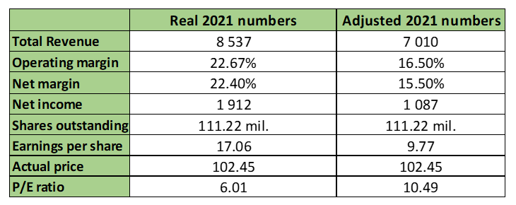 Average ± price change in this segment was historically 12.8% so I think that it does make sense to assume that 12 percentage points of this year’s price growth will be sustainable and the remaining 50 percentage points will just be the impact of deferred demand. Same price growth of 12% in 2021 was also seen in the Engineered Materials segment. The following table shows the incorporation of this assumption into the company’s earnings to give at least an approximation of the company’s financial results without the impact of deferred demand.