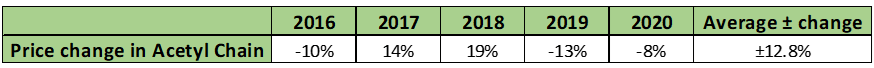 Price change in Acetyl Chain segment (Annual reports 2016 – 2020)