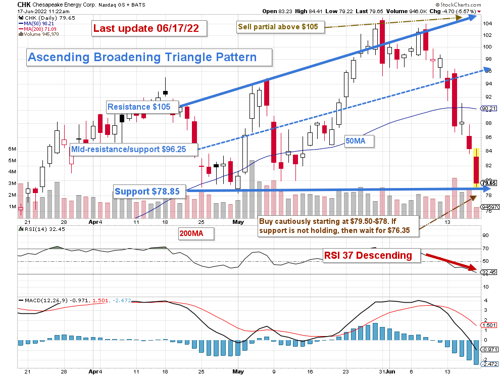 The recent 75-point hike by the Fed triggered a big selloff in the oil and gas sector last week, driven by fear of a possible recession by 2023. Hence, we may have entered a period of consolidation in this sector, which was considered overbought. Thus, I suggest buying CHK below $79.50 with a possible bottom at or below $70.
