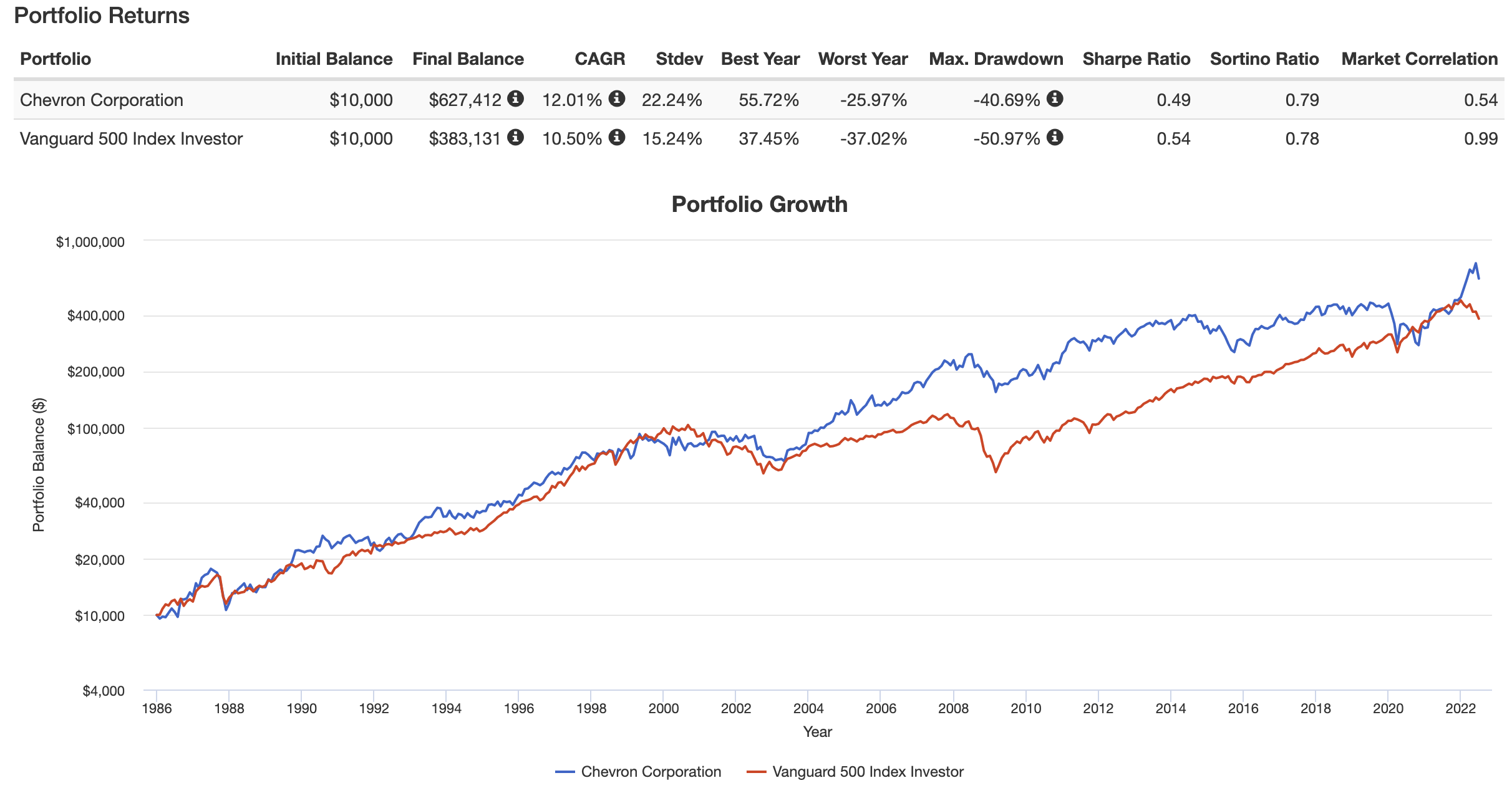 Since 1985, Chevron has returned 12.0% per year, beating the S&P 500 by roughly 150 basis points. The standard deviation was just 22.2%, which allowed the company to keep up with the S&P 50 on a volatility-adjusted basis as well (Sharpe/Sortino ratios).