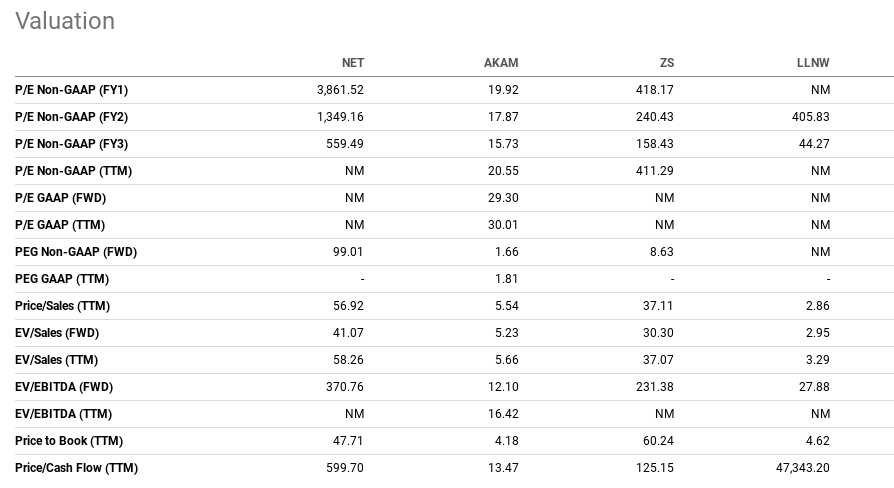 In this section I’ll talk about the contentious issue of NET’s valuation, which I’ll use a handful of its peer companies to create a comps benchmark. The companies I used in this comparison include Akamai Technologies (AKAM), Zscaler Inc (ZS), and Limelight Networks Inc (LLNW).