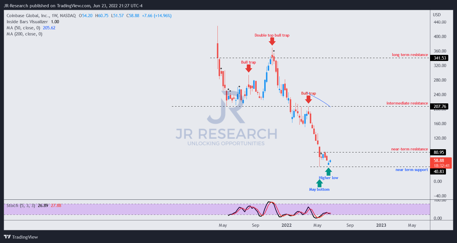 Moreover, it formed another higher low last week (June 13 week) and attempted to mount a near-term recovery. Therefore, we believe the opportunity for a speculative counter-trend exposure has arrived. Notwithstanding, COIN remains deeply mired in its bearish bias. Therefore, any counter-trend add should be accompanied by appropriate risk management strategies to minimize outsized drawdowns.