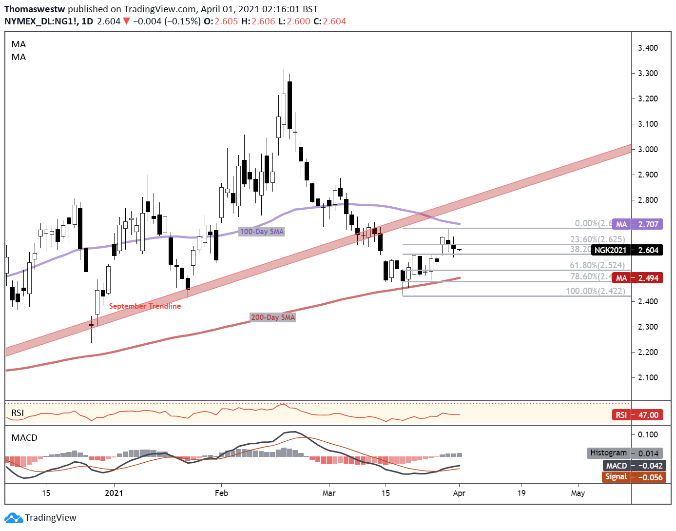 March trading has seen natural gas drop below its 100-day Simple Moving Average (SMA), with a subsequent selloff to the supportive 200-day SMA. Moreover, prices pierced below a trendline from the September swing low between those two key SMAs. Overall, price action is now on a more bearish footing given these technical moves.
