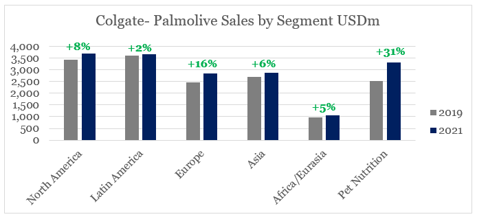 Topline growth rate to pre-pandemic levels is also relatively high. In Developed Markets (North America and Europe) and Pet Nutrition, Colgate significantly expanded its business, while growth in Emerging Markets experienced significant FX headwinds.