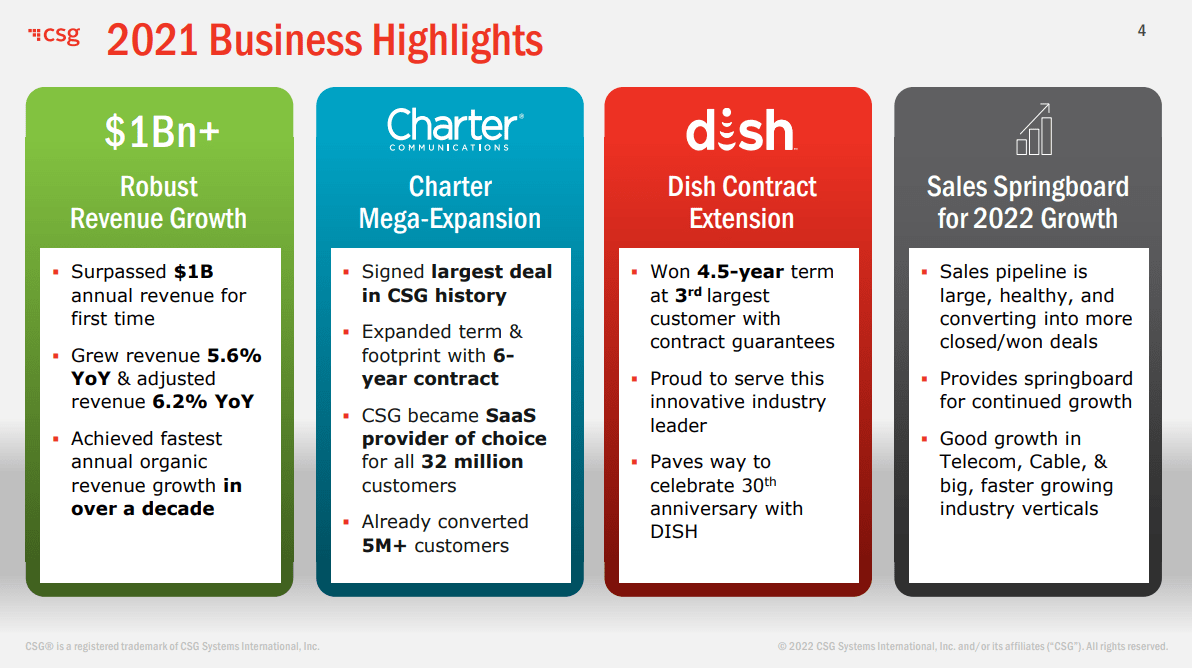 In 2021 CSG passed a major milestone with over $1 billion in revenues generated for the first time in the company’s history. In the company’s Q4 2021 earnings presentation, they summarized the 2021 highlights on the following slide.