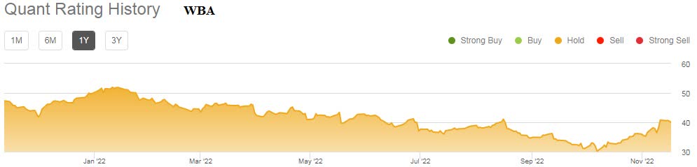 Quant ratings over the last year for both stocks are lackluster at best, showing nothing but Hold ratings for both CVS and WBA over the entire time period.
