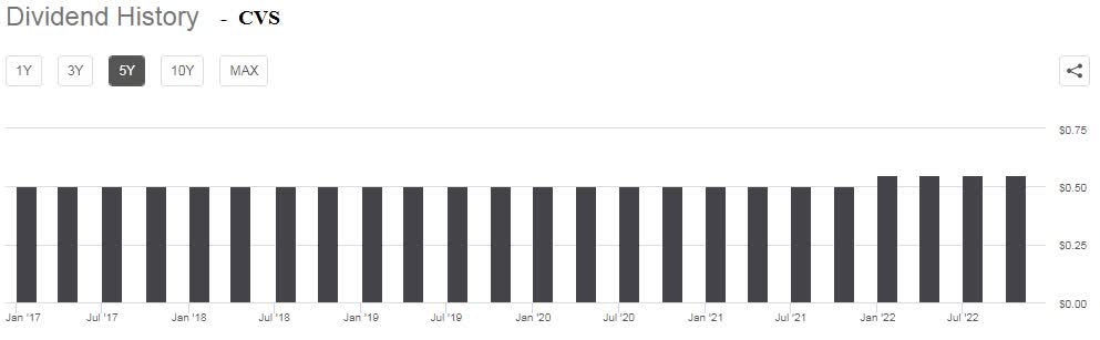 CVS raised its dividend recently from .50 to .55 per quarter. For the four prior years, the dividend was stuck at .50.
