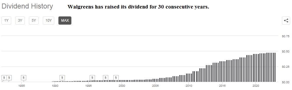 On the other hand, Walgreens has consistently raised its dividend and is in fact a Dividend Aristocrat having raised its dividend for 30 consecutive years, an impressive achievement.