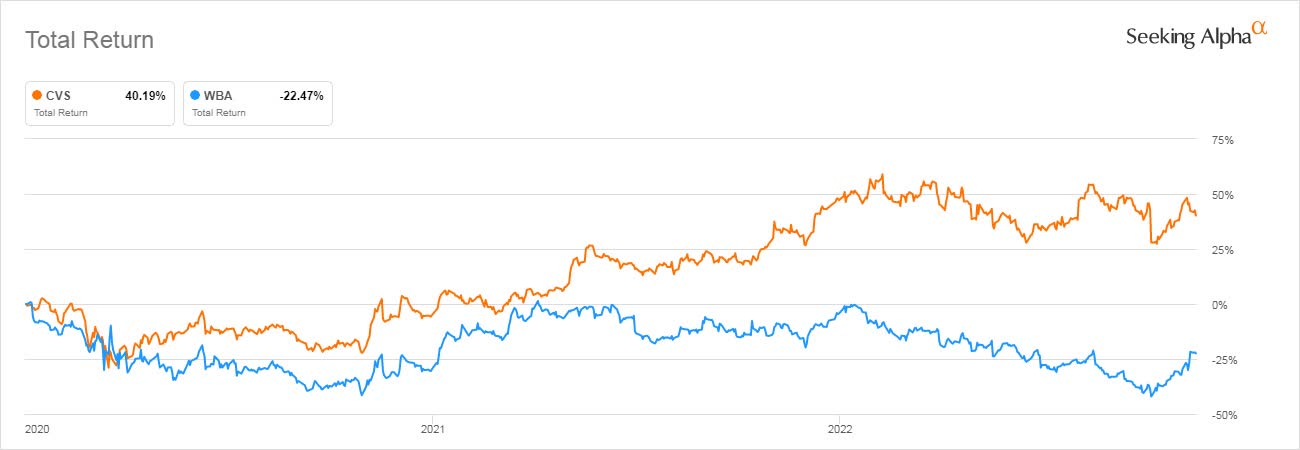 If we look at the total return (which includes dividends) for both companies using the date of Jan. 1, 2020, as the beginning of COVID-19 we can see that CVS has done extremely well with an increase of 40% while Walgreen has actually fallen by 22%. This might imply that CVS is more resilient in difficult economic times than Walgreen is.