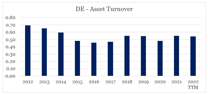 Total asset turnover has been relatively flat since 2015 and thus did not play a major role in trend we saw above.