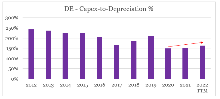 As expected, both the level of working capital and capex to depreciation ratio are now beginning to normalize and with that Deere’s free cash flow per share is likely to be lower in 2022.