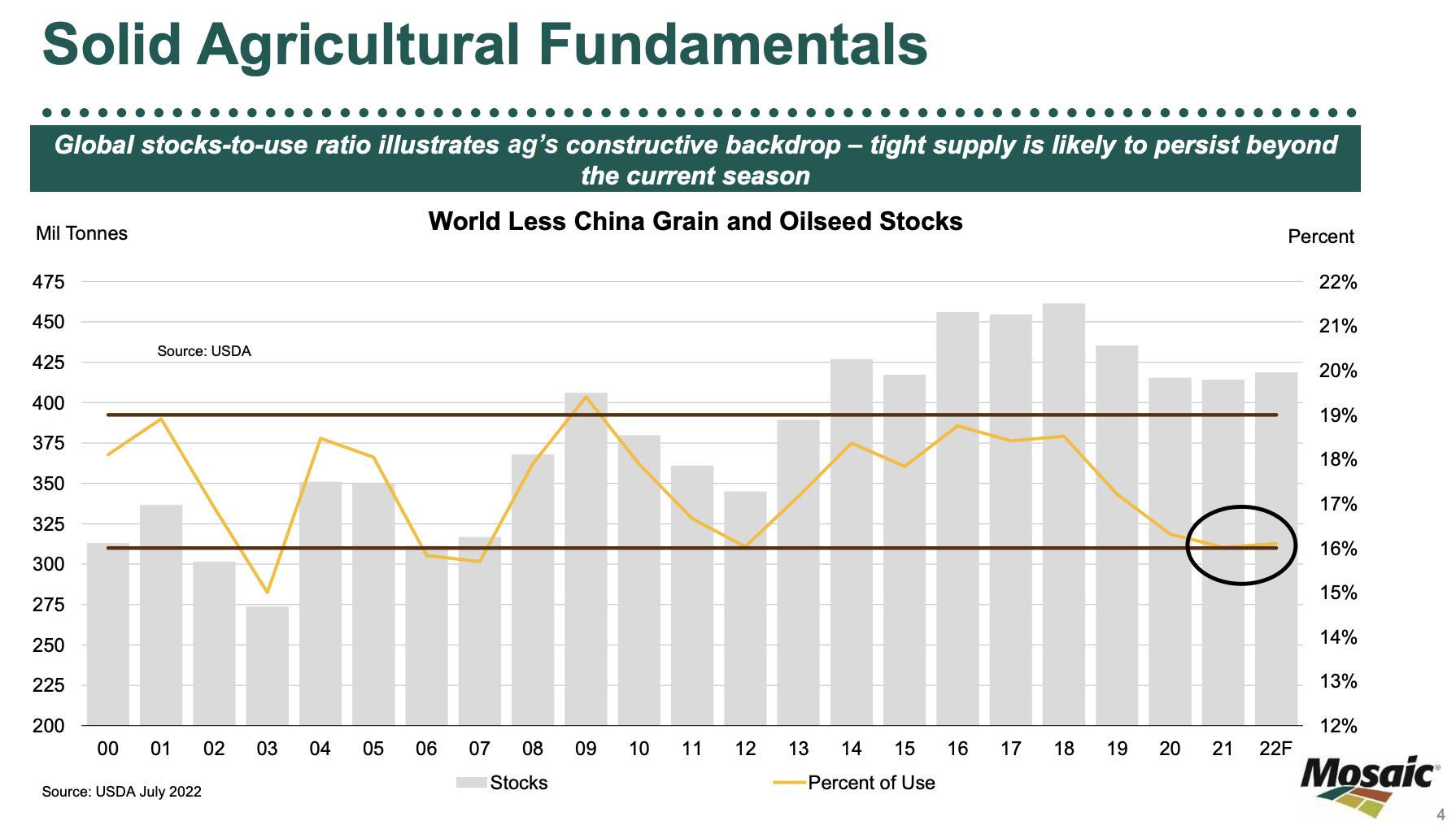 Overall, ag fundamentals remain really strong. Corn and soy prices have declined from a few months ago, but so of inputs like fertilizer and others. Also when you look at global stocks to use, it’s tight and it’s expected to decline again, continuing to support elevated crop prices. May also take a couple of seasons to recover those grain stocks to normal levels.