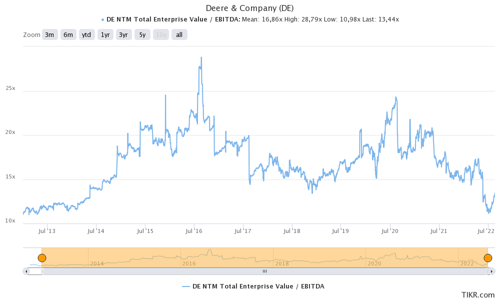 Deere is now back at a market cap of $113 billion. When adding $32.7 billion in expected 2023 net debt (less than 2.8x EBITDA), and $2.9 billion in pension liabilities give the company an enterprise value of $148.6 billion. That’s 12.6x 2023E EBITDA of $11.8 billion. Note that adjusted EBITDA margins are set to recover to 23.0% as supply chain issues fade.