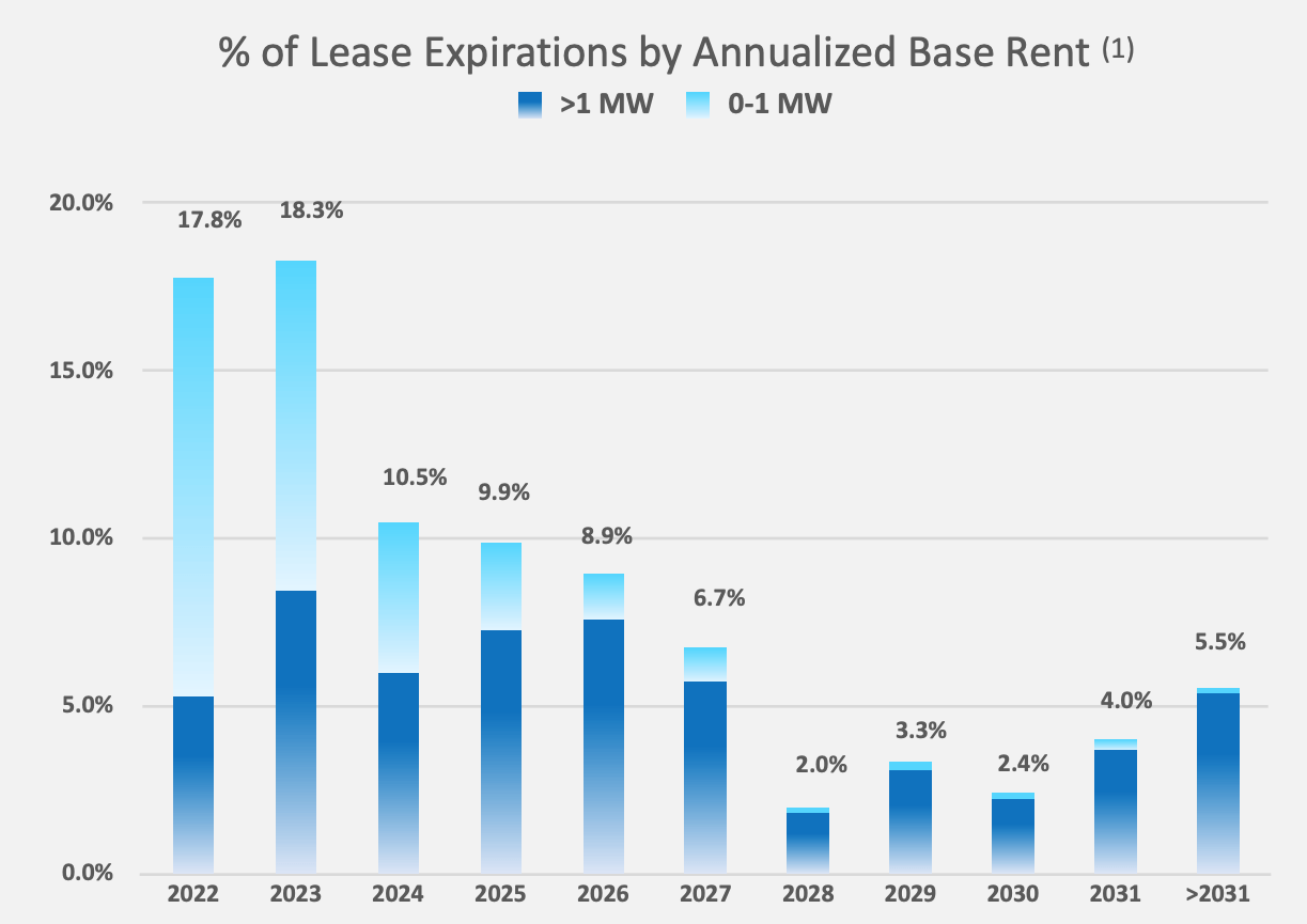 Digital Realty has staggered lease expiration dates, with 17.8% in 2022 and 18.3% in 2023, thus I expect some volatility in the next two years. However, the rest of the lease expiration dates are well diversified across many different years ahead, thus this should guarantee stable operations.
