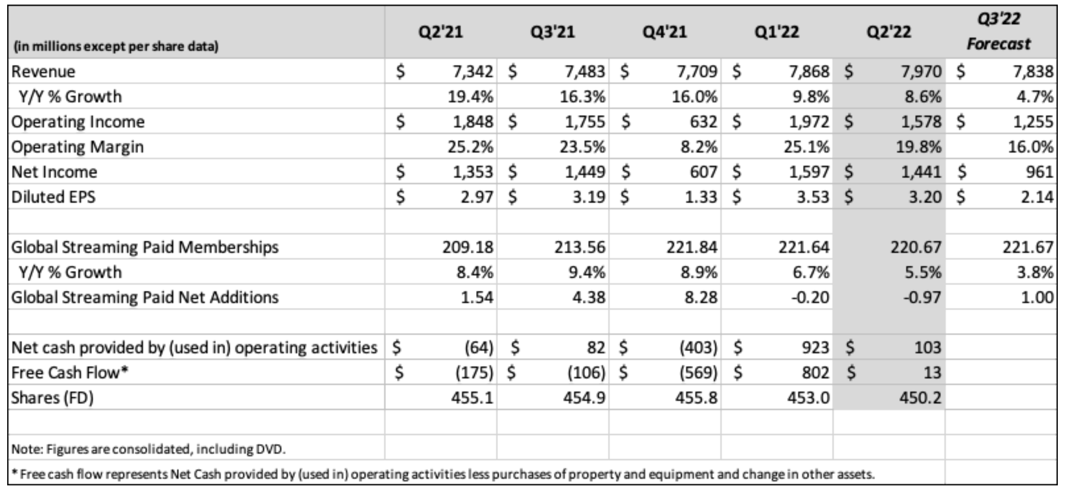The picture for NFLX is less rosy. As aforementioned, to me, the essence of its Q2 ER is “better than expected”. As you can see from the summary results (taken from its Q2 shareholder letter), the top line grew moderately (8.6% YoY). To be fair, the foreign exchange created a 4% headwind, so the revenue growth would be 13% on a constant currency basis. But then, DIS revenue growth would higher too on a constant currency basis. The bottom-line numbers are even more concerning. Operating income came in at $1.58B, a 15% decline from Q2 2021’s $1.84B and a 20% sequential decline from its Q1 2022’s $1.97B. Operating margin contracted to 19.8% from 25.2% a year ago and 25.1% a quarter ago. And of course, as aforementioned, on top of these issues, the business is losing subscribers at a concerning rate as it commented in its shareholder letter: