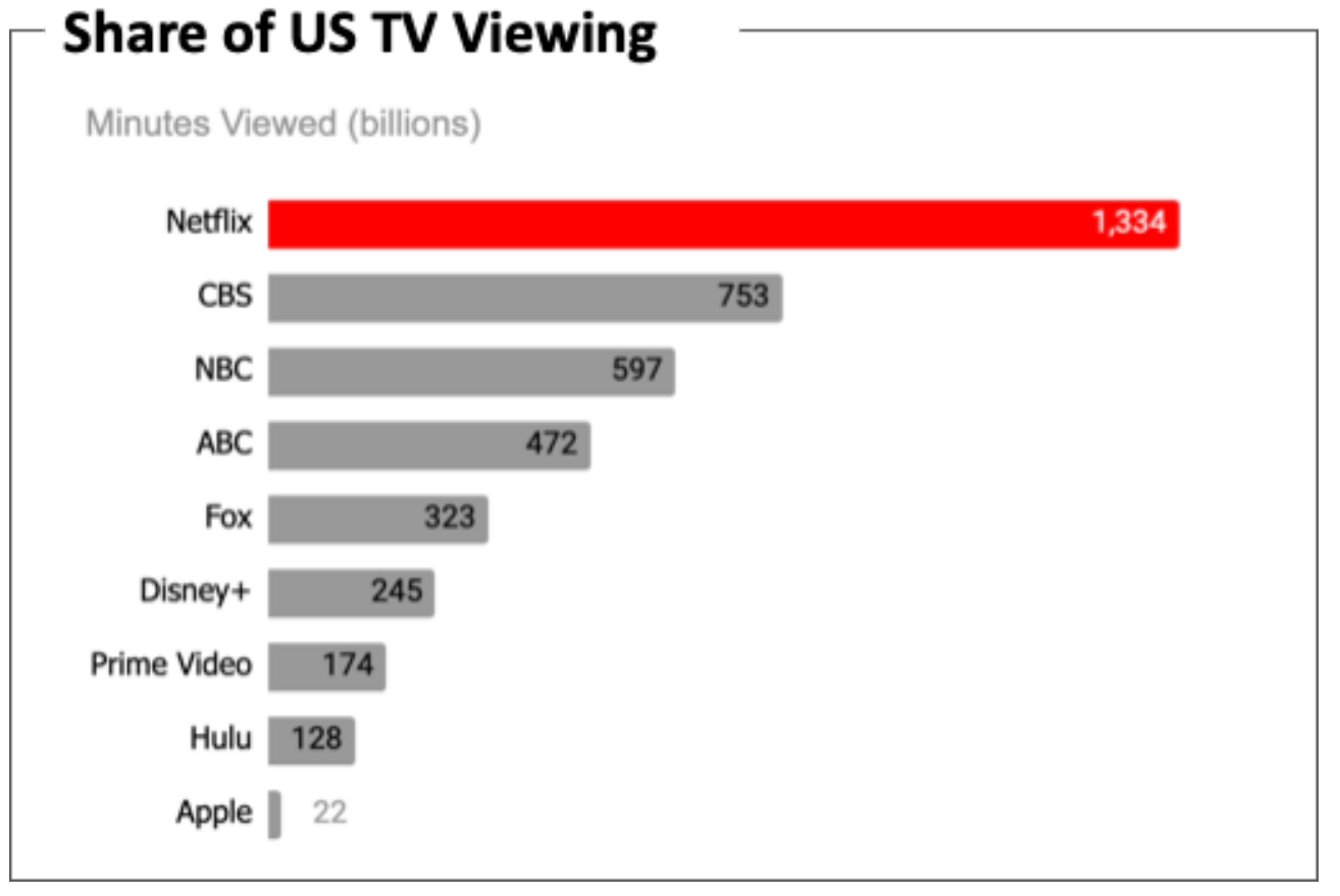In the TV space, NFLX enjoys a lead. In the US, the most competitive TV market in the world, NFLX attracts the most TV viewing time during the 2021-22 TV season (see chart below provided by Nielsen). NFLX reported a total of 1,334 billion minutes of viewing time, leading the second and third places (CBS and NBC, respectively) by a wide margin.