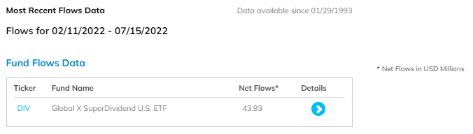DIV registered $44 million in inflows since early February 2022, which represents nearly 6% of the fund’s latest assets under management. Investors are probably betting on a rally given the fund flows and are trying to capitalize on the higher dividend yield. However, engaging in yield chasing when the economy is slowing down is a dangerous strategy given the fact that dividends and buybacks are the first to take a hit when the economy turns south.