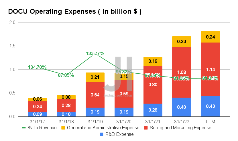 Nonetheless, it is also clear that DOCU has not achieved net income profitability, given its elevated operating expenses thus far. By the LTM, the company reported $1.81B of operating costs, constituting 81.34% of its growing revenues then. Still massive in our opinion, since the company will not be reducing any of its workforce as with many Tech Giants, despite the slowing revenue growth.