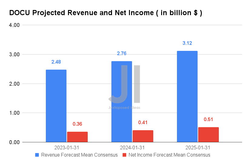 Over the next three years, DOCU is expected to record revenue growth at a CAGR of 14.11% while also finally reporting net income profitability from FY2023 onwards. Its net income margin is also expected to improve from 14.5% in FY2023 to 16.3% in FY2025. For FY2022, consensus estimates the company to report revenues of $2.48B and net incomes of $0.36B, representing impressive YoY growth of 18% and 83.7%, respectively.