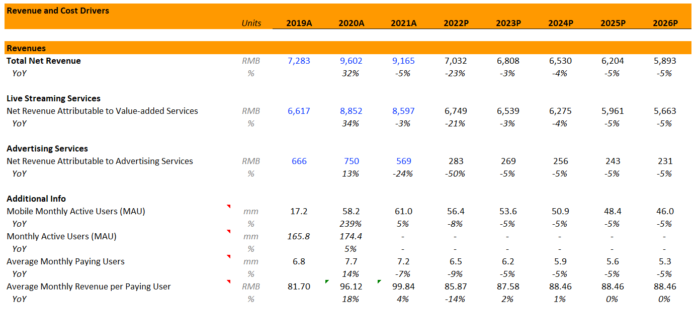 As such, we have projected a fair valuation of DOYU using the P/FCF method. Before figuring out how much FCF DOYU would be likely to have in the next 5 years, we have to project its revenue and cost through these drivers below.