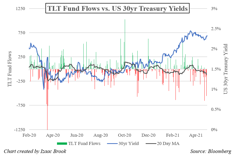 On April 23rd, TLT saw its largest one-day outflow since the height of the Treasury market turmoil in the spring of 2020. Other large redemptions occurred throughout the week, with one of the largest on record occurring the day of the FOMC meeting. With tapering likely on the horizon and no adjustments to the maturity of the Fed’s current purchases, longer-term Treasuries and related ETFs may see further selling pressures in the near future, which could see yields tick higher.