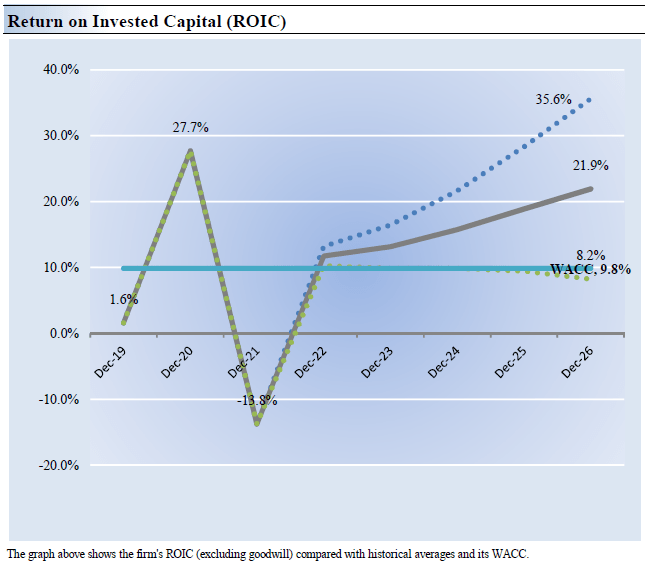 The best measure of a firm’s ability to create value for shareholders is expressed by comparing its return on invested capital with its weighted average cost of capital. The gap or difference between ROIC and WACC is called the firm’s economic profit spread. DuPont’s 3-year historical return on invested capital (without goodwill) is 5.2%, which is below the estimate of its cost of capital of 9.8%.