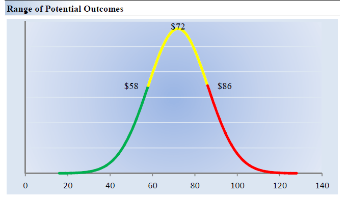 We think DuPont is worth $72 per share with a fair value range of $58.00 – $86.00. The margin of safety around our fair value estimate is driven by the firm’s LOW ValueRisk™ rating, which is derived from an evaluation of the historical volatility of key valuation drivers and a future assessment of them.