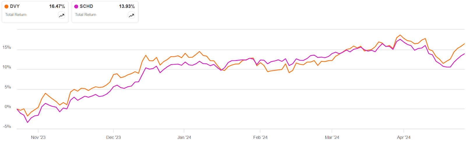 The following chart shows the price trend for DVY and SCHD in the past 6 months.