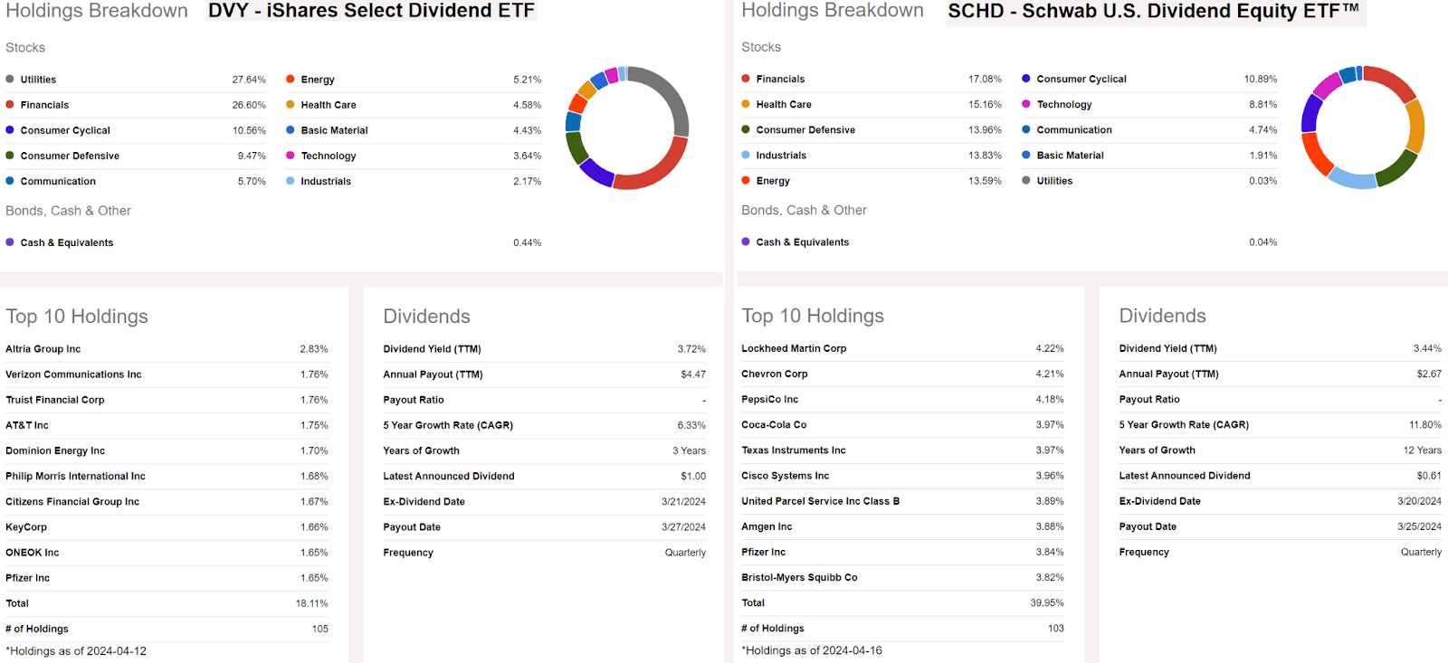 Looking further into DVY, I can find a diversified portfolio of about 100 dividend-paying stocks across different sectors and industries. However, comparing it with SCHD portfolio as shown below, I noticed the following subtle differences: