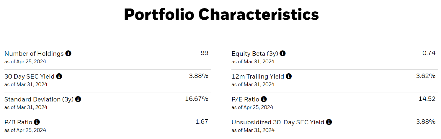 According to the iShares official site, DVY invests in high-dividend-yielding U.S. stocks. It is a large equity ETF with about $18 billion in Net Assets. As shown below, DVY pays a good dividend with a 3.62% 12-month trailing yield. The PE looks healthy at 14.52%, and the volatility is relatively low.