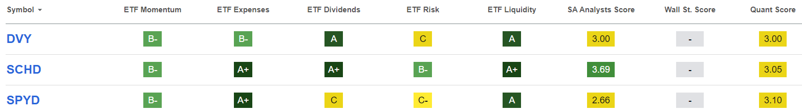 Using the SA rating system to compare three dividend ETFs, DVY has strength in dividend category.