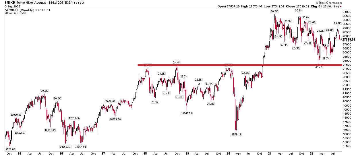 Stock market investors might care little about the goings-on with USDJPY. But they should pay close attention to it. There’s a way to take advantage of a downward trend in the yen along with gaining exposure to the Japanese stock market. The benchmark Tokyo Nikkei Average (Nikkei 225) is holding up quite well compared to other major stock market averages. Notice in the chart below that the Nikkei held the critical 24,500 level on a test of key support back in March. While U.S. and European markets continue to struggle in their own bear markets, there has been relative strength in Japan for the better part of six months.