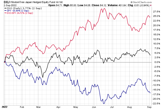 Couple a falling yen with a somewhat resilient Nikkei, and there is an opportunity for active investors. The WisdomTree Japan Hedged Equity ETF (NYSEARCA:DXJ) gives investors exposure to Japanese dividend-paying companies while hedging the USDJPY pair (shorting the yen). So far in 2022, DXJ is up just 4% total return – nothing too impressive on an absolute basis. Compared to the S&P 500 ETF (SPY), however, DXJ is up 25%, and not far from multi-year highs.