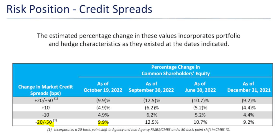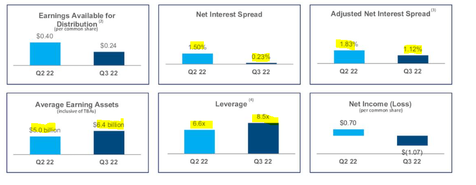 The company is obviously making the bet that things normalize rapidly but it does dial up risk for this relatively (and we stress the relatively part) conservative mortgage REIT. Leverage at the end of Q3-2022 was a stunning 8.5X. This follows a similar trend that we have seen among other mortgage REITs, which decided to bet on normalization by raising their leverage. Also, notable here was the collapse in interest spreads with net interest spread absolutely flatlining and adjusted interest rate spread dropping by 71 basis points. These are all big warning signs and running up 8.5X leverage with margins collapsing likely creates problems ahead.
