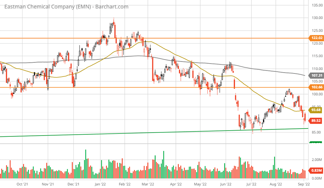 Eastman Chemical 1-year daily chart (Created by Brian Kapp using a chart from Barchart.com )