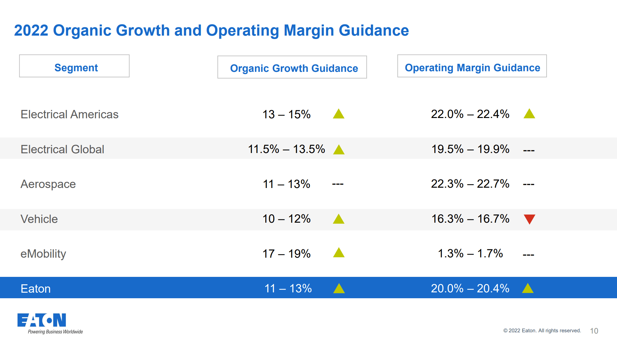 Eaton Corp. (NYSE:ETN) once again delivered record operating margins and non-GAAP EPS in its 2Q 2022 results. The company also raised the organic sales growth forecast for the year to 12% above 2021 levels. This is enough organic growth to make up for both the sale of the Hydraulics segment in 2021 and the foreign exchange hit to sales from a stronger dollar. Of course, in a high inflation environment, strong revenue growth is expected. More notably, Eaton still managed to report record operating margins of 20.1% this quarter, 1.5% above 2Q 2021 levels. The company also raised the operating margin forecast for the year with strength in Electrical Americas more than offsetting a margin decline in Vehicle.