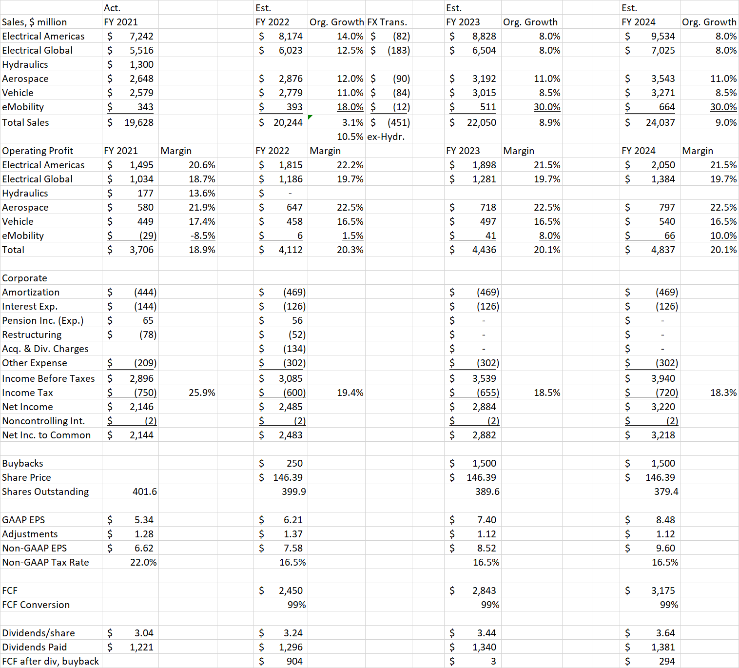 For 2023, I conservatively took sales growth back down where the 2022 assumptions were at the start of this year. The exception is eMobility, where I assume 30% sales growth to be in line with the company target of $1.2 billion in sales by 2025. I leave margins the same as the current forecast except for a slight trim in Electrical Americas. In eMobility I assume 8% operating margin in 2023 and 10% in 2024 on the way to the company target of 11% in 2025.