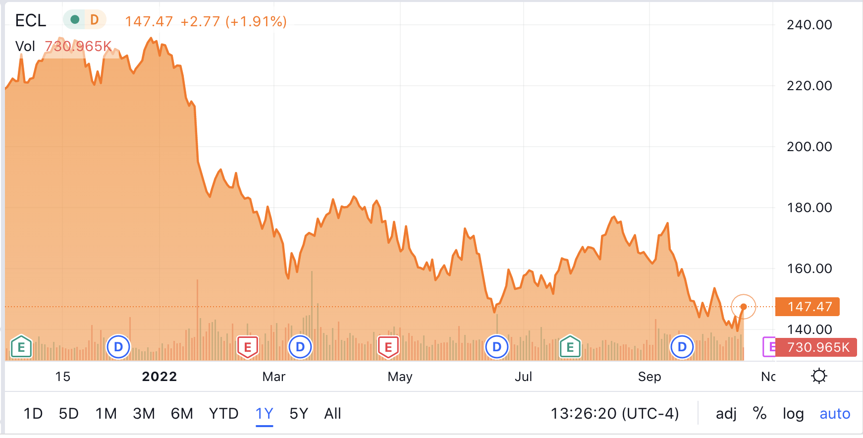 Given the company is banking on a strong Q4 to lift full year EPS to at least $4.50 and propel a reacceleration in growth in 2023, these economic headwinds may serve to dent some of the benefits ECL is now receiving on pricing. When the company reports third quarter earnings on November 1, risks are skewed to management having to temper expectations somewhat, especially if a weakening economy leads to some reticence on the part of customers to accepting price hikes.