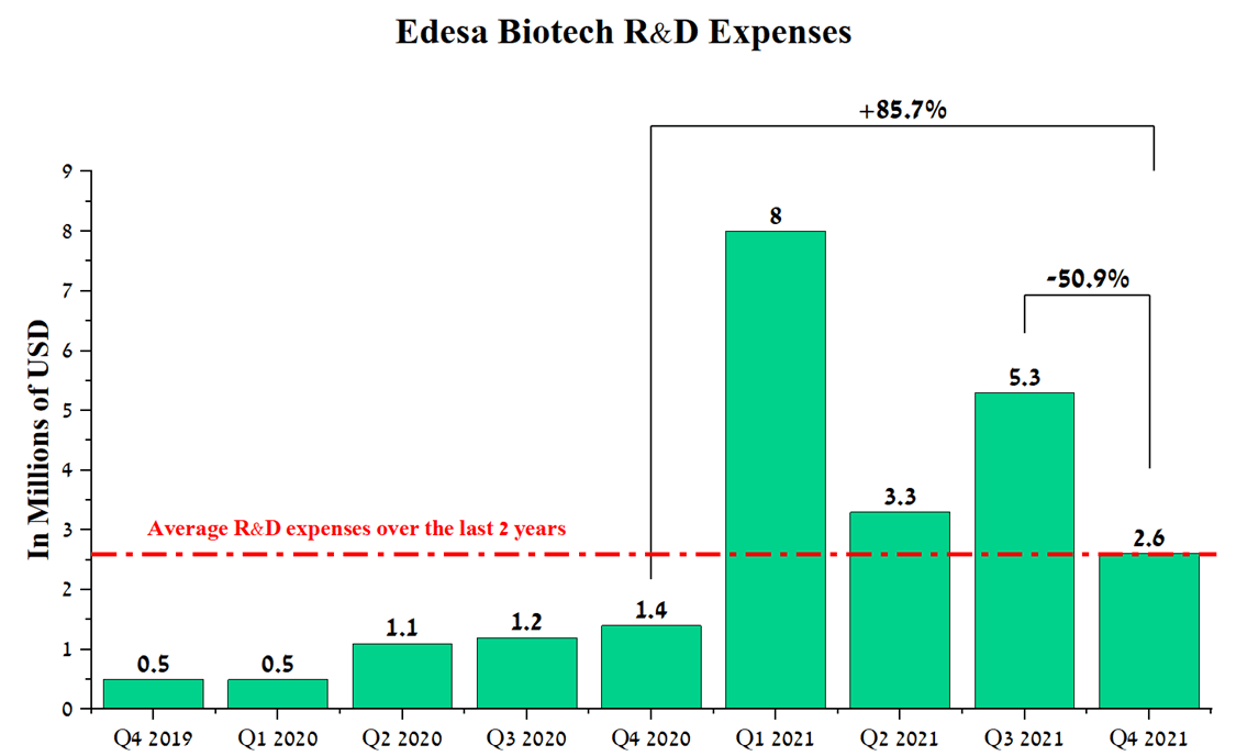 The company has an extensive pipeline of 5 product candidates. To increase shareholder value, the company has focused its financial resources on the development of EB01, which has a novel mechanism of action based on sPLA2 inhibition for the treatment of ACD. In addition, with a $12 million grant from the Government of Canada, Edesa continues to rapidly develop EB05 as a new treatment for ARDS. In the 4th quarter of 2021, the company reported positive results in the treatment of critically ill patients in phase 2, which evaluated the efficacy and safety of this medicine. Edesa continues to effectively manage R&D expenses, which was $2.6 million in Q4 2021, down 50.9% from Q3 2021. In addition, with a recent $10 million capital injection, the company has sufficient cash to keep the company in business for at least another 12 months.