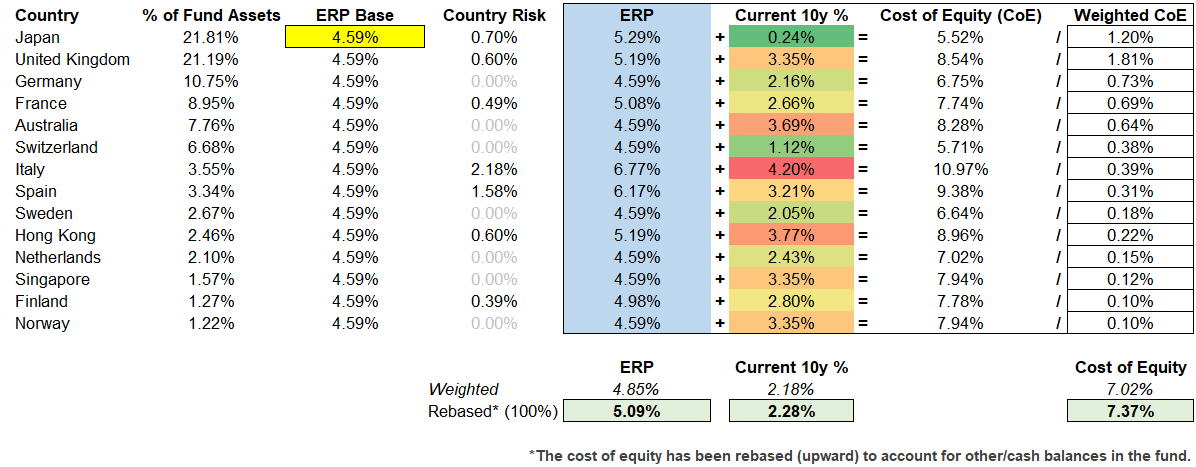 I calculate the fund’s weighted risk-free rate as being 2.28%, using 10-year bond yields, and using Professor Damodaran‘s workings for equity risk premia (including country risk premiums). The net result is a cost of equity of 7.37%.